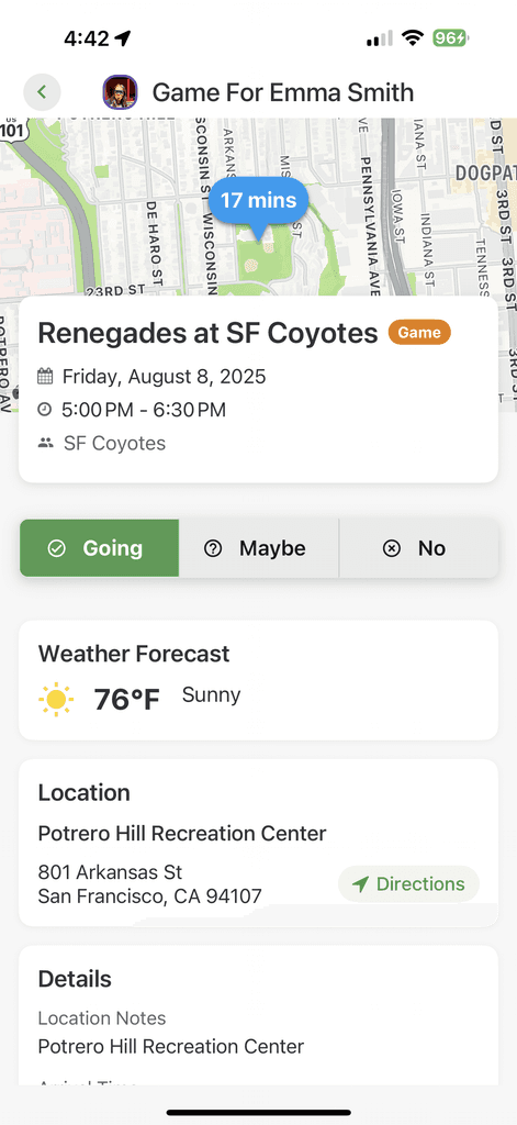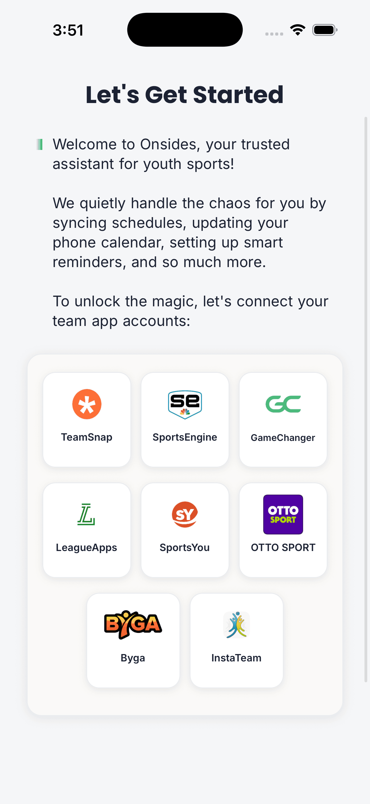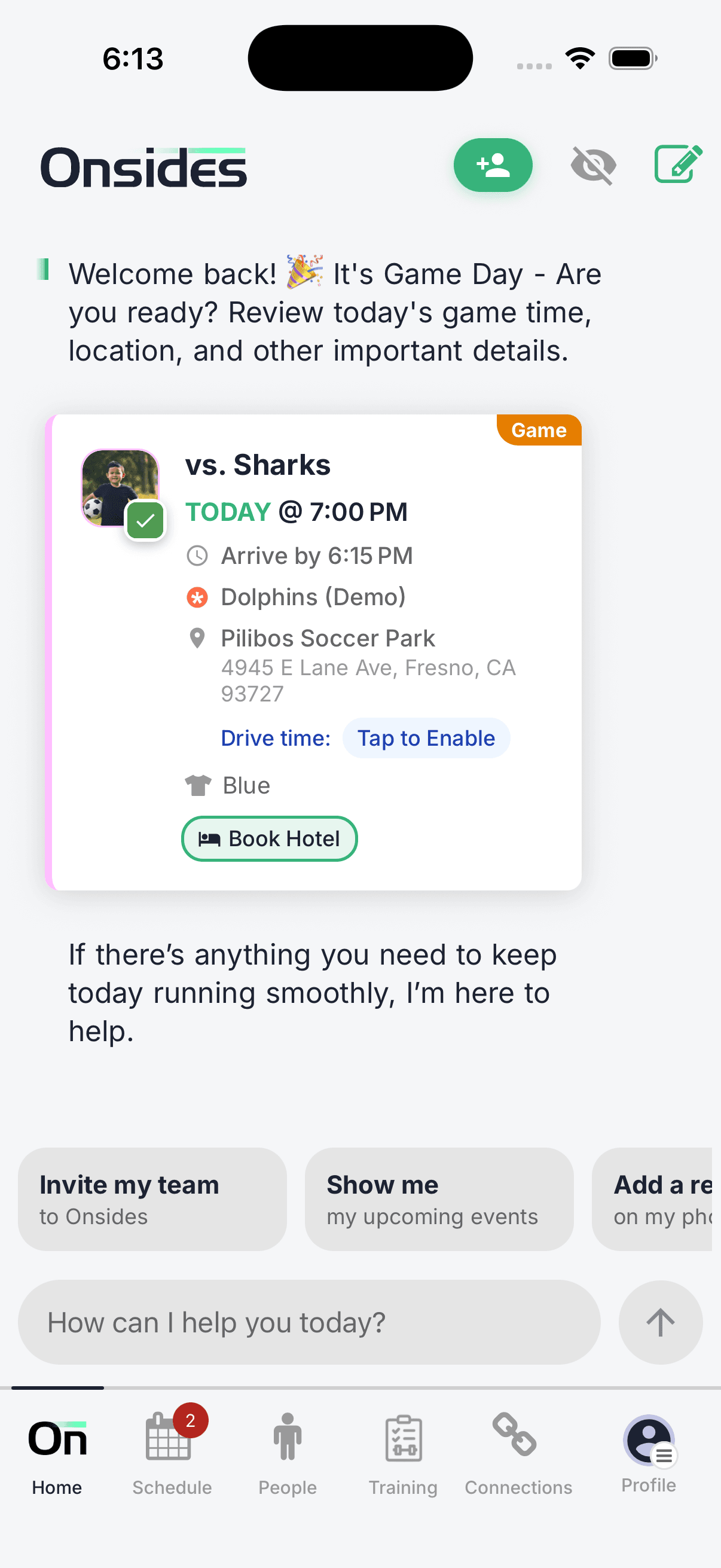 Onsides connects the sports apps you already use. Update availability once, keep every team in sync, and see conflicts, drive times, weather, and more before they happen.
